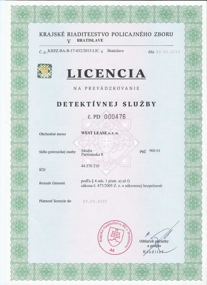 West lease sro licencia - Súkromný detektív | WEST LEASE s.r.o.